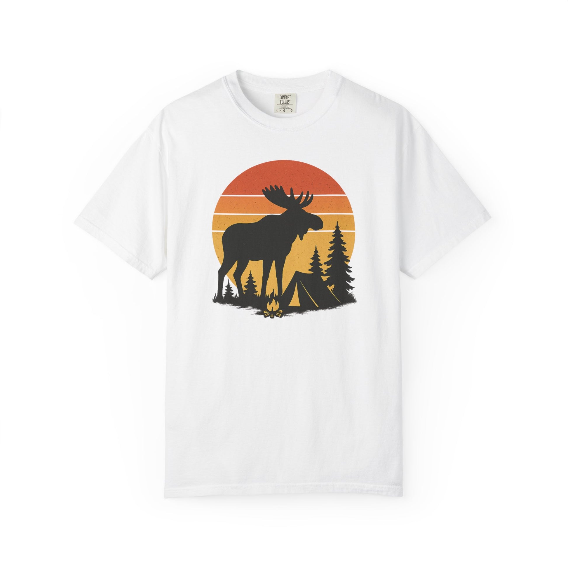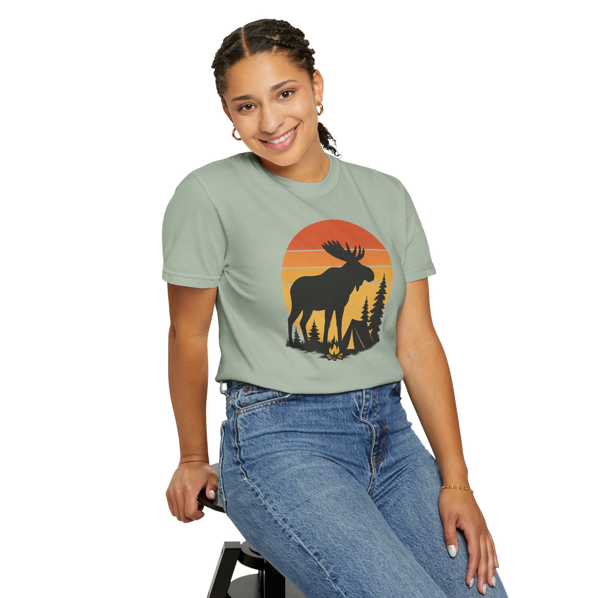 A bold moose silhouette with trees, a tent, and campfire against a vintage sunset — perfect for campers, nature lovers, and outdoor adventures.